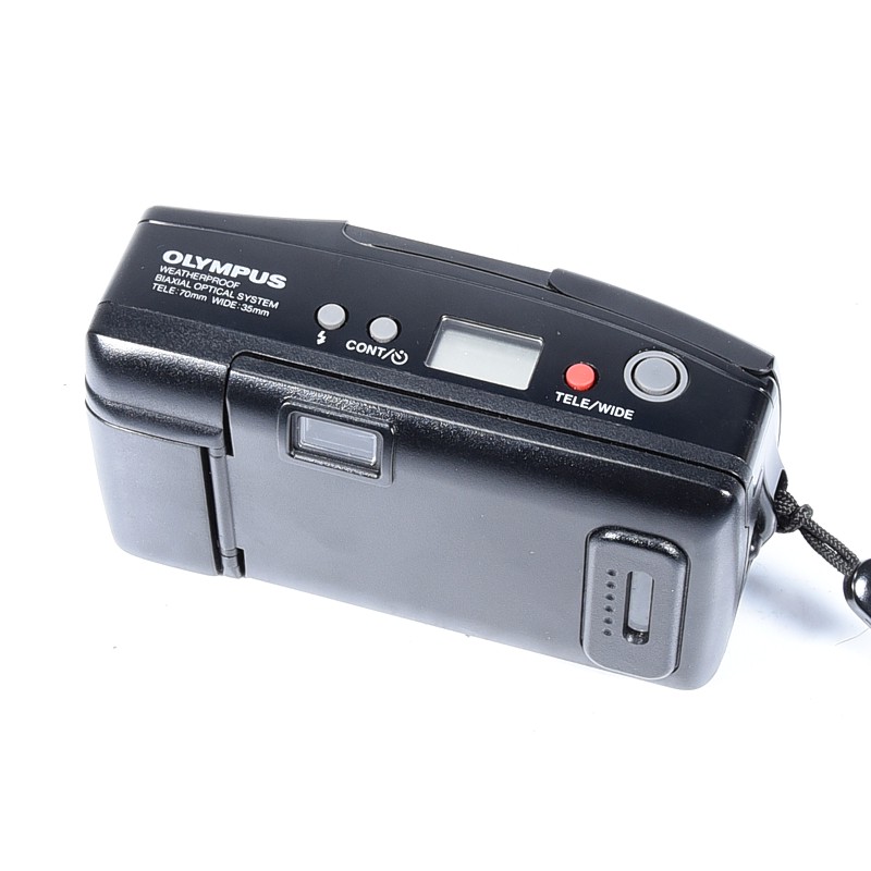 Teraz, jeśli chcesz sfotografować odległy obiekt, przełącz się na obiektyw 70 mm. Krótko mówiąc, bardzo prosty zoom. Inną szczególną cechą w tamtym czasie była wodoodporność aparatu Olympus AF-1 Twin. Aparat odczytuje czułość filmu za pomocą kodowania DX, następnie sam ustawia ekspozycję, a film jest również transportowany automatycznie. Źródłem zasilania jest bateria CR123 3V (brak w zestawie).