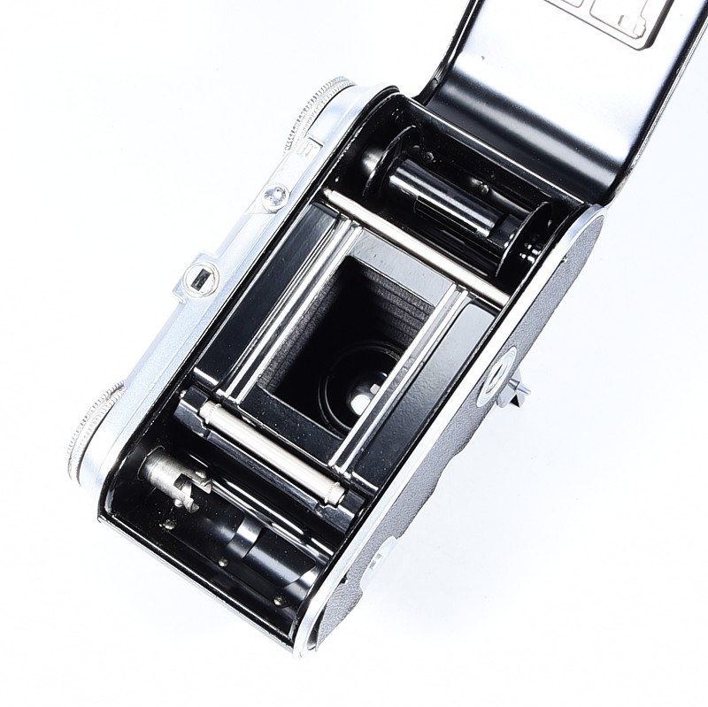 Aparat w bardzo dobrym stanie, mechanizmy działają, migawka sprawna (nawet trzyma czasy za wyjątkiem długich), aparat sprzedajemy jako kolekcjonerski – może wymagać regulacji czyszczenia itp
