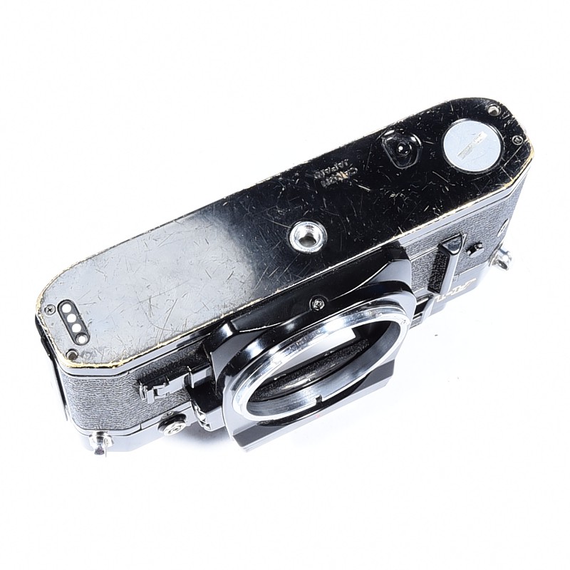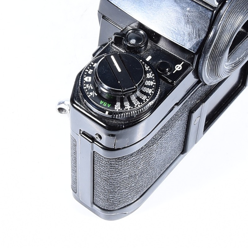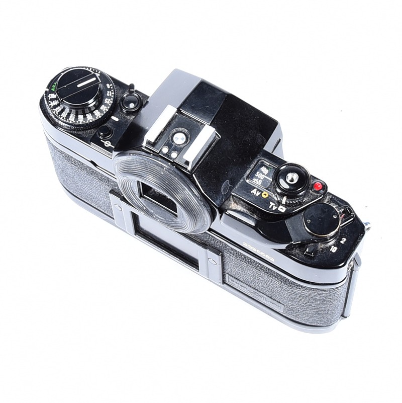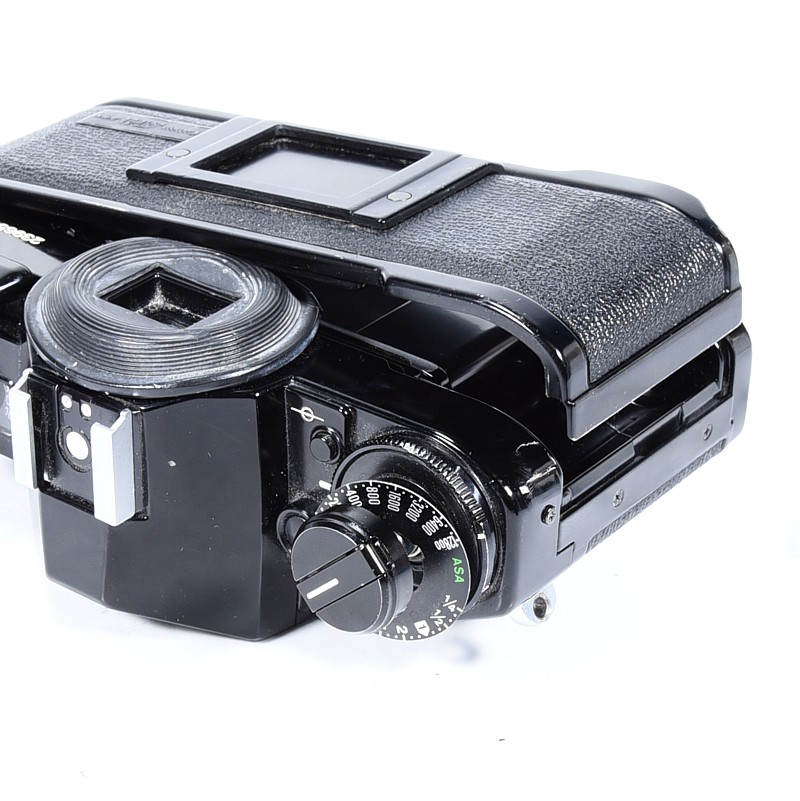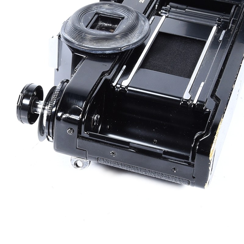 Aparat prawdopodobnie po upadku, uszkodzony prawy narożnik (pęknięcie obudowy) oraz wgniecone pokrętło nastaw czułości ISO (działa ale bardzo ciężko pracuje), aparat posiada ślady użytkowania, migawka działa, trzyma czasy, matówka bez skaz – kilka pyłków, klapka od baterii niepopękana, elektronika sprawna – aparat z przeznaczeniem na części lub naprawy !