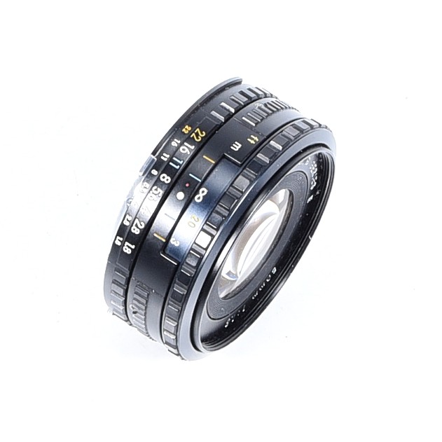 Aparat używany w pięknym stanie, minimalne ślady użytkowania – mały grawer na dolnej płycie, matówka bez skaz – kilka pyłków, drobne otarcia na tubusie obiektywu, troszkę „sucho” pracuje pierścień ostrości, szkła czyste bez grzyba i rys, aparat jest sprawny