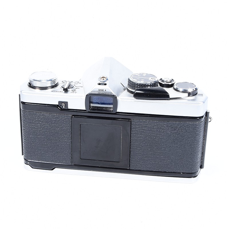 Aparat używany w pięknym stanie, minimalne ślady użytkowania – delikatne otarcia i ryski na korpusie, matówka bez skaz – czyściutka, sprawny