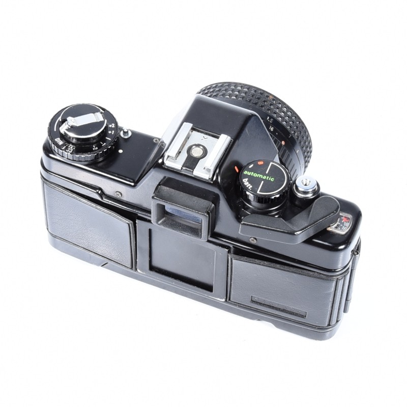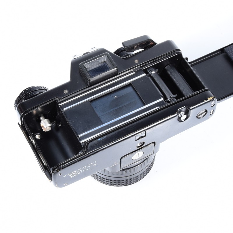 Aparat w średnim stanie, widoczne ślady użytkowania, mechanicznie sprawny, automatyka szwankuje (przekłamuje światłomierz), optyka bez rys – obiektyw jest sprawny